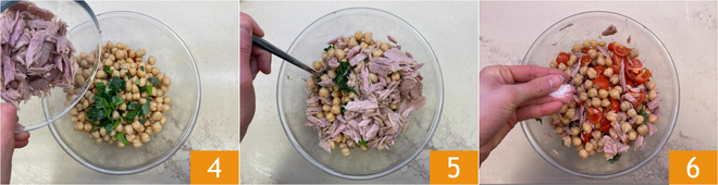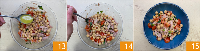 Tempere a salada 13, misture 14 e sirva. Sua salada de grão-de-bico e atum está pronta para ser servida 15.