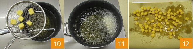 Agora aqueça o óleo de sementes para fritura a uma temperatura de 170°, mergulhe poucos cubos de polenta de cada vez 10 11 e cozinhe até dourar, em seguida, escorra em uma bandeja forrada com papel absorvente 12.