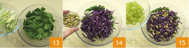 Agora que todos os ingredientes estão prontos, você pode montar a salada: numa tigela grande coloque o espinafre, o funcho 13, o repolho, os pistaches descascados 14 e os bagos de uva 15.