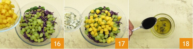 Para completar, adicione também os cubos de polenta 16 e o Roquefort 17. Prepare o molho, despejando em uma tigelinha o azeite, o sal, a pimenta e o vinagre 18.