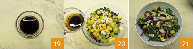 Misture para combinar o tempero 19 e despeje sobre a salada somente na hora de servir 20. A salada de inverno com croutons de polenta está pronta para ser saboreada 21!
