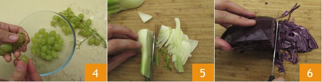 Enquanto isso, lave as uvas e coloque os bagos em uma tigela 4. Lave, corte as pontas e fatie finamente o funcho 5 e também corte o repolho em tiras 6.