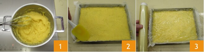 Para preparar a salada de inverno, pegue apolenta pronta 1 e despeje-a em uma assadeira de 30 x 23 cm forrada com papel-manteiga 2, distribuindo-a com uma espátula para criar uma camada de cerca de 1 cm de altura. Cubra com filme plástico 3 e coloque na geladeira por cerca de 20 minutos.