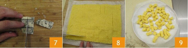 Corte o queijo em pequenos pedaços 7 e pegue a polenta de volta. Primeiro, corte tiras de 2 cm de largura no sentido horizontal 8 e depois corte tiras no sentido vertical da mesma medida para obter cubos de 2x2 cm de altura de cerca de 1 cm 9.