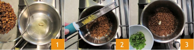 Para preparar a salada de lentilhas e quartirolo, comece temperando as lentilhas pré-cozidas. Em uma panela onde você aqueceu o óleo e o alho, adicione as lentilhas escorridas 1. Em seguida, adicione a casca de limão ralada, o sal e deixe temperar em fogo baixo por 5-10 minutos 2. No final do cozimento, desligue e adicione a salsinha picada 3,