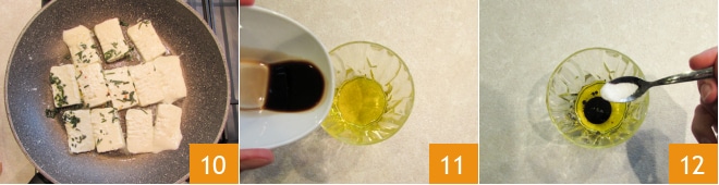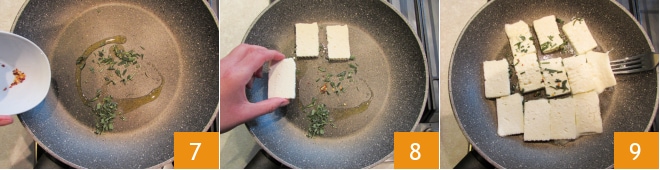 Volte ao fogão, aqueça uma frigideira antiaderente com um fio de óleo, perfume o fundo com a mistura de ervas picadas e uma pimenta vermelha esfarelada 7. Adicione em seguida as fatias de queijo 8 e cozinhe em fogo alto por alguns instantes de um lado e depois do outro 9.