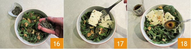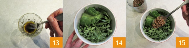 e emulsione tudo com um garfo 13. Passe para a composição. Em uma tigela, coloque o espinafre e a rúcula 14, decore com um pouco de lentilhas 15,