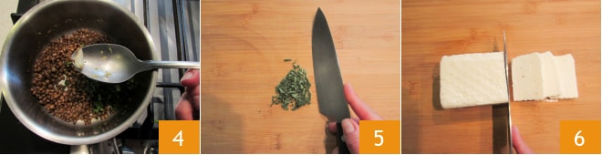 remova o alho e deixe esfriar 4. Enquanto isso, pique com uma faca a sálvia e o alecrim 5 e corte o quartirolo em fatias de meio centímetro 6.
