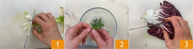 Para preparar a salada de macarrão de inverno, comece pelos vegetais: pegue a endívia e separe os brotos do caule, depois corte os caules em pedaços de cerca de 4 cm 1. Elimine os caules da rúcula e coloque as folhas em uma tigela 2. Remova a parte branca interna do radicchio 3.