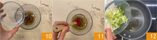 Dilua o molho com a água 10 e misture 11, depois reserve o tempero. Passe para a cocção dos vegetais: em uma frigideira, aqueça o óleo de sementes e adicione somente os caules da endívia 12.