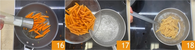 Salgue 16 e salteie também por 7 minutos em fogo médio para que murcharem levemente, devem permanecer crocantes. Prepare a massa: leve uma panela com água salgada para ferver, então cozinhe as penne de lentilhas 17 e escorra após 6-7 minutos 18.