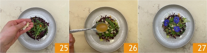 Adicione também as amêndoas em lâminas 25, depois retire o aro e finalize com o molho 26, folhas de cerefólio e flores comestíveis. Sua salada de macarrão de inverno gourmet está pronta para ser servida 27!