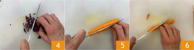 Corte as folhas em tiras finas 4. Descasque as cenouras, divida-as ao meio 5, depois corte-as em losangos, aproximadamente do mesmo tamanho das penne 6.
