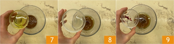 Agora prepare o molho: em uma tigela, coloque o purê de umeboshi, o óleo de gergelim torrado 7, o xarope de agave, o suco de limão 8 e a pimenta fresca picada 9.