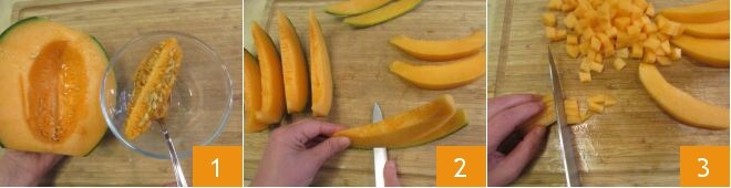 Para preparar a salada de melão, comece limpando-o. Elimine as duas extremidades, divida-o ao meio e retire a parte com sementes e fiapos usando uma colher 1. Depois fatie e retire a casca 2 e, por fim, corte em pedaços de cerca de dois centímetros 3.
