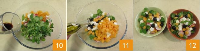 Acrescente também os cubos de melão, depois tempere com sal, vinagre 10 e um fio de azeite 11. Misture bem e sirva sua salada de melão decorando, a gosto, com um raminho de hortelã fresca 12.