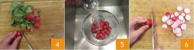 Coloque de lado e ocupe-se dos rabanetes. A primeira coisa a fazer é separar as folhas e a parte com o cabinho 4. Enxágue bem 5 e depois fatie finamente, obtendo rodelas 6.