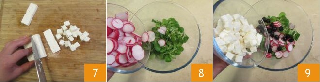 Finalmente, corte em cubinhos o queijo feta grego 7 e componha sua salada. Em uma tigela, coloque o agrião lavado, as rodelas de rabanete 8, depois as azeitonas pretas sem caroço e o queijo feta 9.