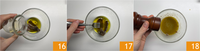 Adicione também o vinagre 16, então misture para dissolver as anchovas 17. Emulsione, depois ajuste o sal e a pimenta 18 a gosto.