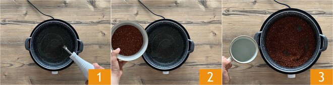 Para preparar a salada de quinoa à grega, comece cozinhando a quinoa vermelha. Em uma panela, coloque um fio de azeite de oliva 1. Adicione a quinoa vermelha 2 e toste-a por alguns minutos, mexendo de vez em quando. Despeje a água cobrindo totalmente a quinoa.