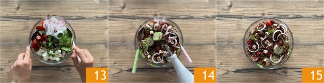 Misture 13 e tempere com um fio de azeite de oliva 14. A salada de quinoa à grega está pronta para ser servida 15.