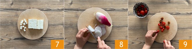 Corte o feta em cubos 7. Fatie a cebola finamente 8. Lave os tomatinhos e corte-os ao meio ou em mais partes 9.