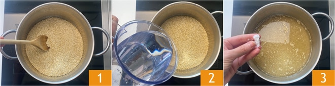 Para preparar a salada de quinoa com edamame e vegetais, primeiro enxágue a quinoa em água corrente para eliminar a saponina, depois escorra bem. Torre a quinoa em uma panela por alguns minutos 1, depois cubra com água 2, adicione sal e deixe cozinhar por cerca de 8-10 minutos 3.