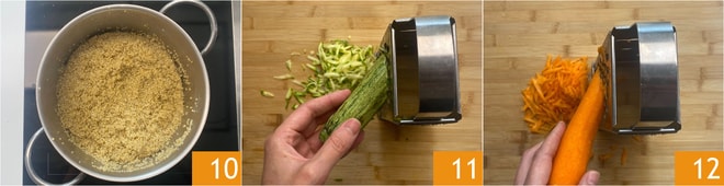 Após o tempo de cozimento, a quinoa terá absorvido toda a água 10, então deixe descansar por 5 minutos. Enquanto isso, termine de preparar o restante dos ingredientes: rale tanto as abobrinhas 11 quanto as cenouras com um ralador de furos grandes 12.