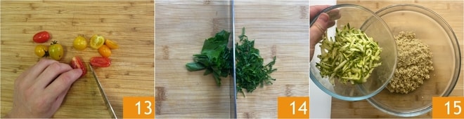 Corte os tomatinhos em pedaços irregulares 13 e pique grosseiramente a salsinha e a menta, reservando algumas folhinhas para a decoração 14. Agora você pode montar sua salada: transfira a quinoa para uma tigela grande e adicione as abobrinhas raladas 15.