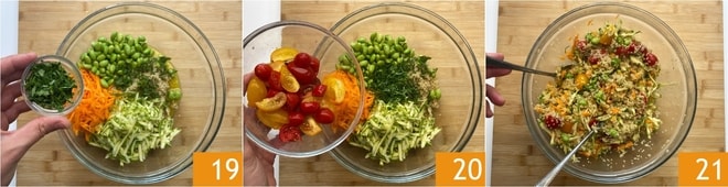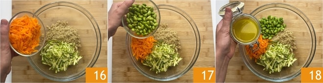 Adicione também as cenouras 16 e o edamame 17, depois tempere com o molho citronette 18.