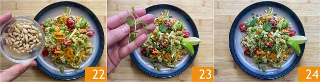Finalize os pratos com uma porção de pinhões torrados 22 e algumas folhinhas de menta 23. Sua salada de quinoa com edamame e vegetais está pronta para ser apreciada 24!