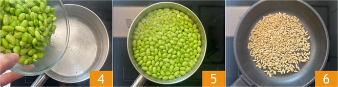 Enquanto isso, leve uma panela com água salgada a ferver, adicione o edamame 4 e deixe cozinhar por cerca de 5 minutos após a água voltar a ferver 5, depois escorra e reserve. Torre os pinhões em uma frigideira por 3-4 minutos 6 e reserve.