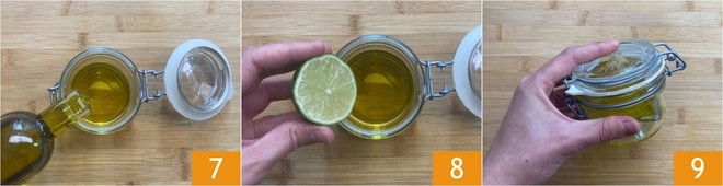 Prepare também o molho citronette: despeje o óleo 7 e o suco de limão em um pote 8, adicione sal, feche com a tampa e agite bem para emulsificar tudo 9.