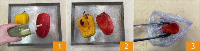 Para preparar a salada de quinoa vegetariana, coloque os pimentões em uma assadeira, regue-os com um fio de azeite 1 e massageie para cobri-los uniformemente. Asse em forno estático pré-aquecido a 200°C por 30 minutos, eles devem ficar bem assados. Em seguida, coloque-os em um saco de alimentos, ainda quentes, e deixe descansar por 10 minutos 3.