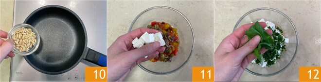 Torre os pinhões em uma frigideira 10. Na tigela com os pimentões, adicione também a feta, as azeitonas, as ervas picadas e acrescente manjericão e hortelã rasgados à mão 12.