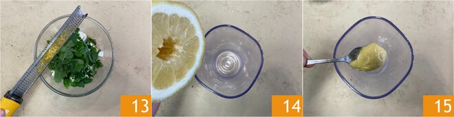 Aromatize com a casca de meio limão 13. Reserve o tempero e prepare a citronete: em um copo alto, despeje o suco de um limão 14 e a mostarda 15.
