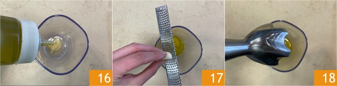 Adicione também o azeite 16 e meio dente de alho picado 17. Bata tudo com o mixer de imersão para obter uma emulsão 18.