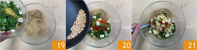 Agora tempere a quinoa com os ingredientes reunidos na tigela 19, os pinhões torrados 20 e a citronete 21. Misture para dar sabor.