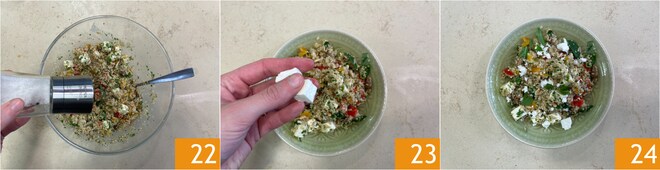 Ajuste o sal e a pimenta 22. Sirva com feta esfarelada a gosto 23. A salada de quinoa vegetariana está pronta para ser saboreada 24.