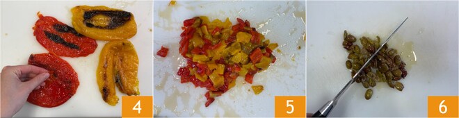 Agora você pode remover a pele facilmente, junto com as sementes e o caule 4. Corte-os em pedaços 5 e coloque-os em uma tigela. Corte grosseiramente as azeitonas 6.