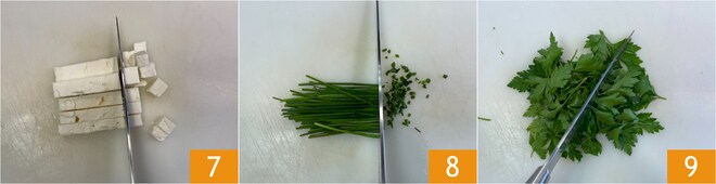 Corte a feta em cubos 7. Pique a cebolinha 8 e a salsa 9.