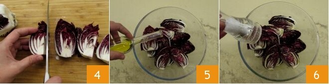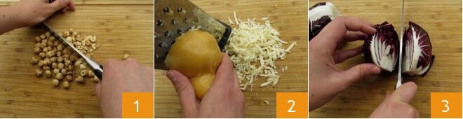 Para preparar a salada gratinada de radicchio, avelãs e scamorza, comece picando as avelãs 1 e ralando o queijo scamorza 2. Lave, retire a base e as folhas externas, depois divida o radicchio ao meio 3;