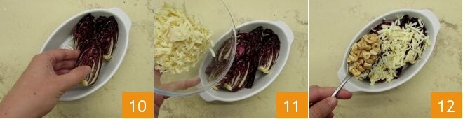 Distribua as fatias de radicchio dentro delas 10. Polvilhe a superfície com o queijo scamorza ralado 11, distribua também as avelãs 12