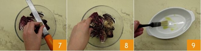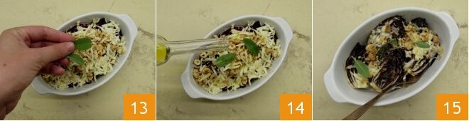 e algumas folhinhas de sálvia 13. Unte novamente a superfície 14, depois leve ao forno pré-aquecido na função grill a 220° por 5 minutos, tempo suficiente para gratinar o queijo e torrar as avelãs 15. Saboreie sua salada gratinada de radicchio, avelãs e scamorza bem quente.