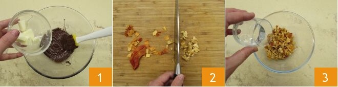 Para preparar o salame de chocolate com frutas exóticas, comece derretendo o chocolate em banho-maria ou no micro-ondas, depois adicione a manteiga e misture até derreter 1. Deixe de lado para amornar e, enquanto isso, pique manga, abacaxi e mamão desidratados 2. Coloque em uma tigela e umedeça com o rum 3.