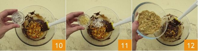 o coco 10, o gengibre 11 e, por último, os biscoitos esmigalhados 12.