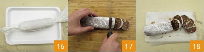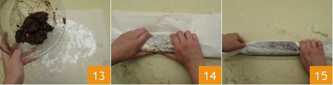 Misture bem até obter uma massa homogênea e transfira-a para uma folha de papel manteiga polvilhada com açúcar de confeiteiro 13. Modele bem com as mãos, ajudando-se sempre com a folha de papel manteiga e forme um grande cilindro 14. Finalmente, envolva o salame como um doce no papel manteiga, girando e apertando as duas extremidades 15.