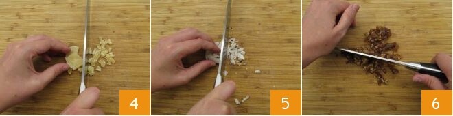 Enquanto isso, pique também o gengibre cristalizado 4, o coco desidratado 5 e as tâmaras sem caroço 6.