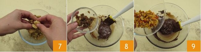 Por fim, esmigalhe os biscoitos em um recipiente 7 e passe para a formação do salame de chocolate. No recipiente com o chocolate derretido e misturado com a manteiga, adicione as tâmaras 8, a mistura de frutas secas que, entretanto, terá absorvido o rum 9,