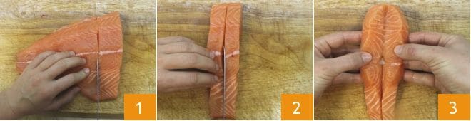 Para preparar o salmão crocante sobre creme de cannellini, comece retirando as espinhas do filé de salmão: use uma pinça e elimine as espinhas que se encontram ao longo do dorso; uma vez executada essa operação, passe a mão nas carnes para garantir que todas foram retiradas. Em seguida, faça o corte em borboleta: corte o filé em 4 fatias largas de aproximadamente três dedos 1 e faça um corte no meio de cada fatia, sem cortar completamente 2; por último, abra as fatias de salmão como um livro 3, coloque-as em um prato e reserve. Este corte pode ser feito mesmo se você tiver um filé de salmão com pele.